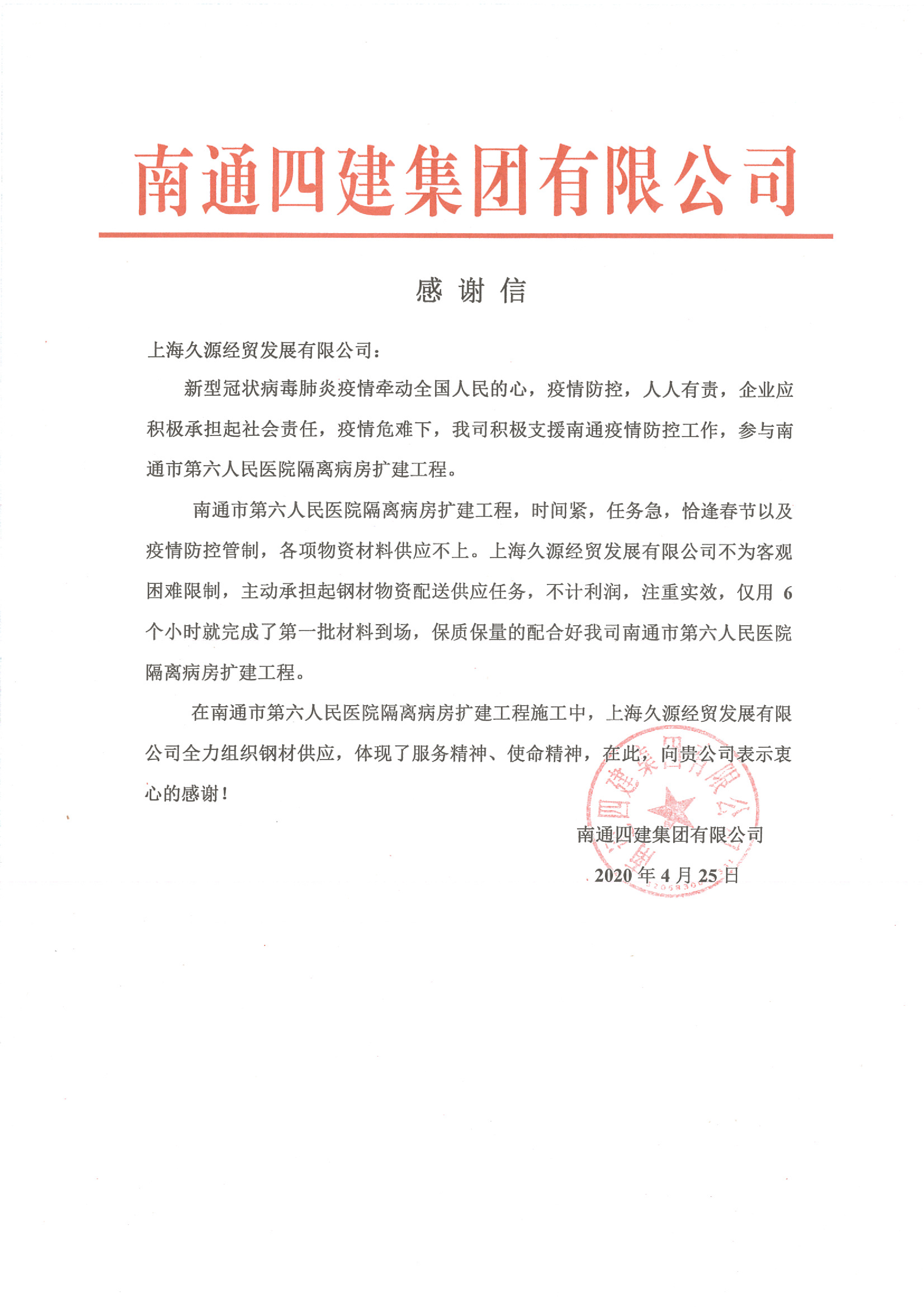南通四建集團有限公司感謝信
