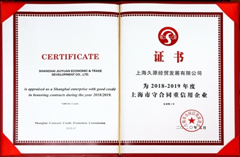 日前,鈺翔控股集團旗下鈺翔環保供應鏈管理(上海)有限公司、上海久源經貿發展有限公司被評為“2018-2019年度上海市守合同重信用企業”,并榮獲AAA級合同信用等級認定。