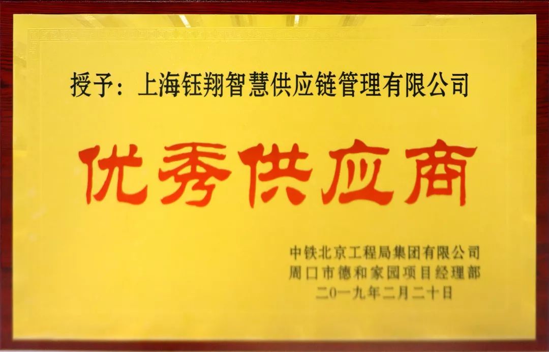 上海鈺翔智慧供應(yīng)鏈管理有限公司被中鐵北京局周口德和家園項(xiàng)目部評(píng)為優(yōu)秀供應(yīng)商